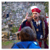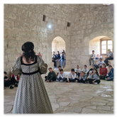 In the distance, music is heard, and the musician makes an entrance, playing a typical medieval wind instrument. The reenactor captures the students' attention and invites them to enter the tower.