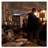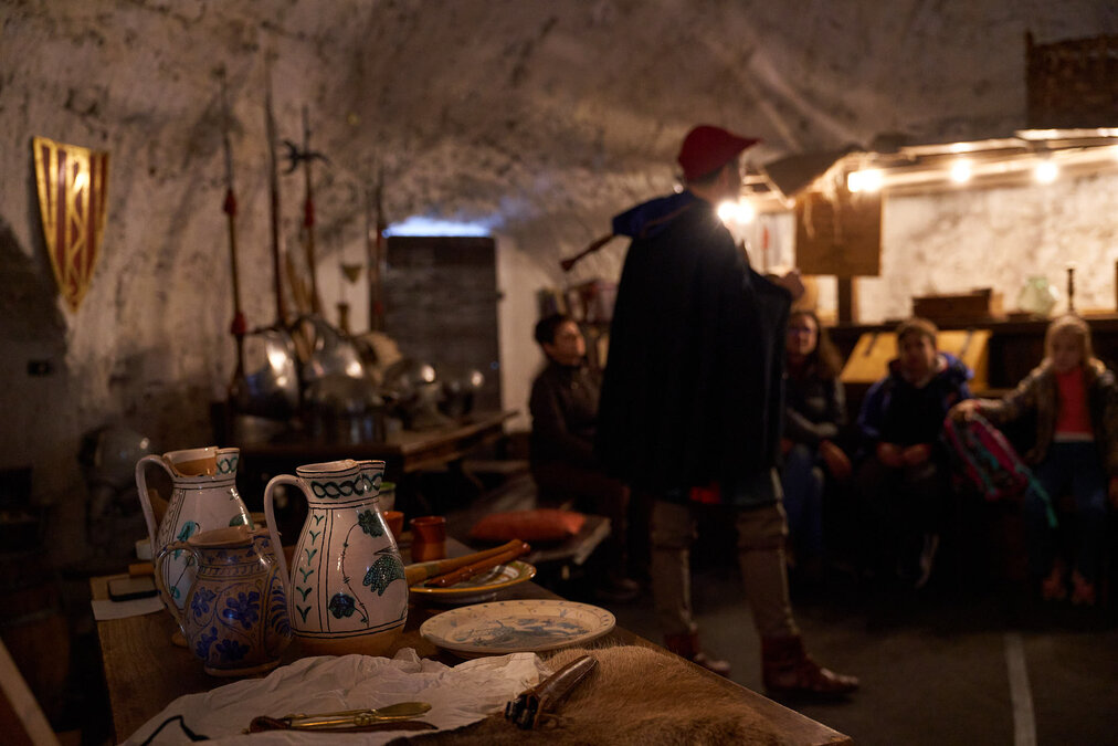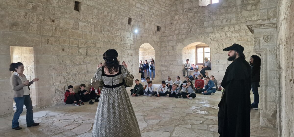 Educational worksheets are distributed for the final part of the event. A specialist, acting as the Lady of the Castle and dressed in typical medieval female clothing, introduces the customs and traditions of castle life. She presents various objects placed on the table: plates, glasses, pitchers, and cutlery. She describes some typical recipes of the time and speaks about the famous medieval beverage "Hippocras." Students find all the information in the provided educational sheets. There is space for questions and answers.