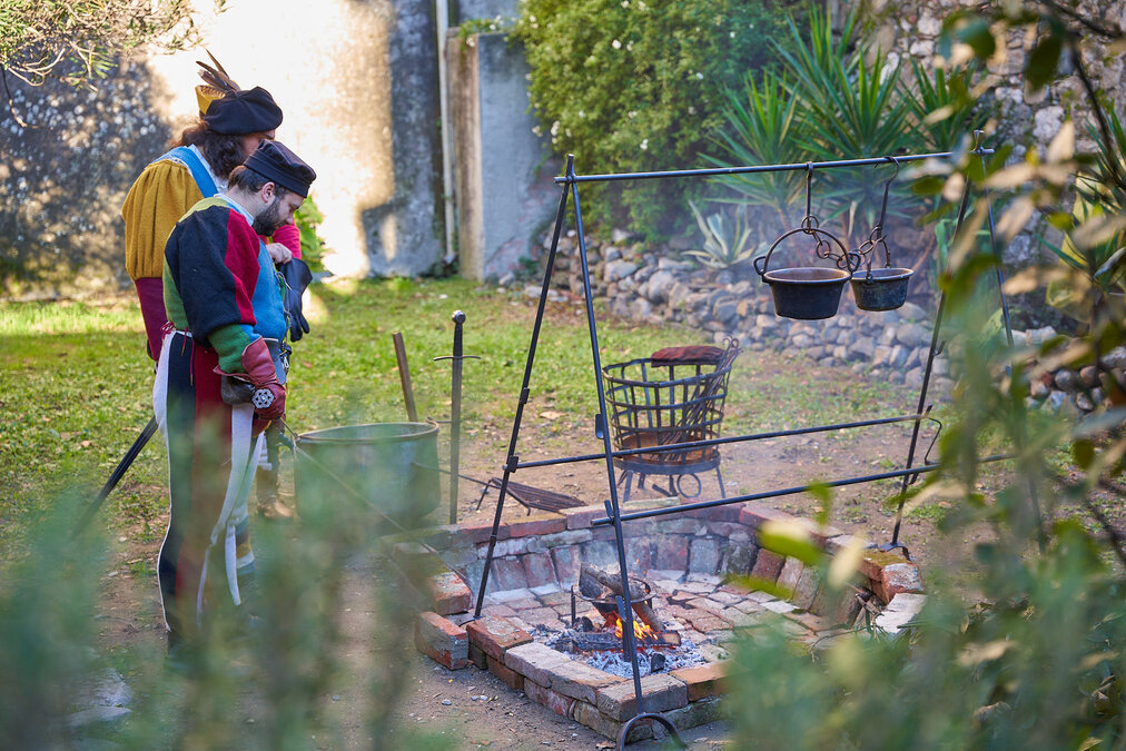 In the moat garden. Simulation of a combat training between two reenactors dressed in medieval clothing. Duel and explanation of the stances and movements of the fighters by the Captain. Description of the weapons used and close observation by the students of the different components of a typical knight’s armor: helmet, breastplate, bracers, thigh guards, and weapons such as swords and pikes. Description of the attire of the armed soldiers.