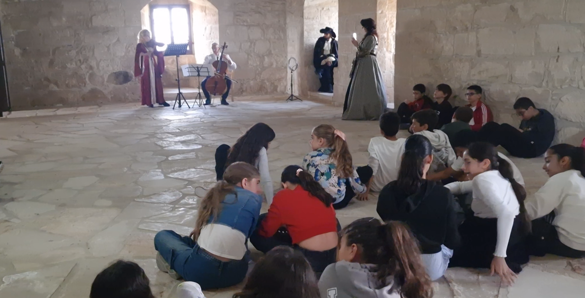 The musician, dressed in medieval attire, introduces the students to the music of the era and performs some pieces using various instruments: flutes of different sizes, bagpipes, small guitars. The performance alternates between explanations and musical pieces. Students have the opportunity to ask questions, which the expert answers.